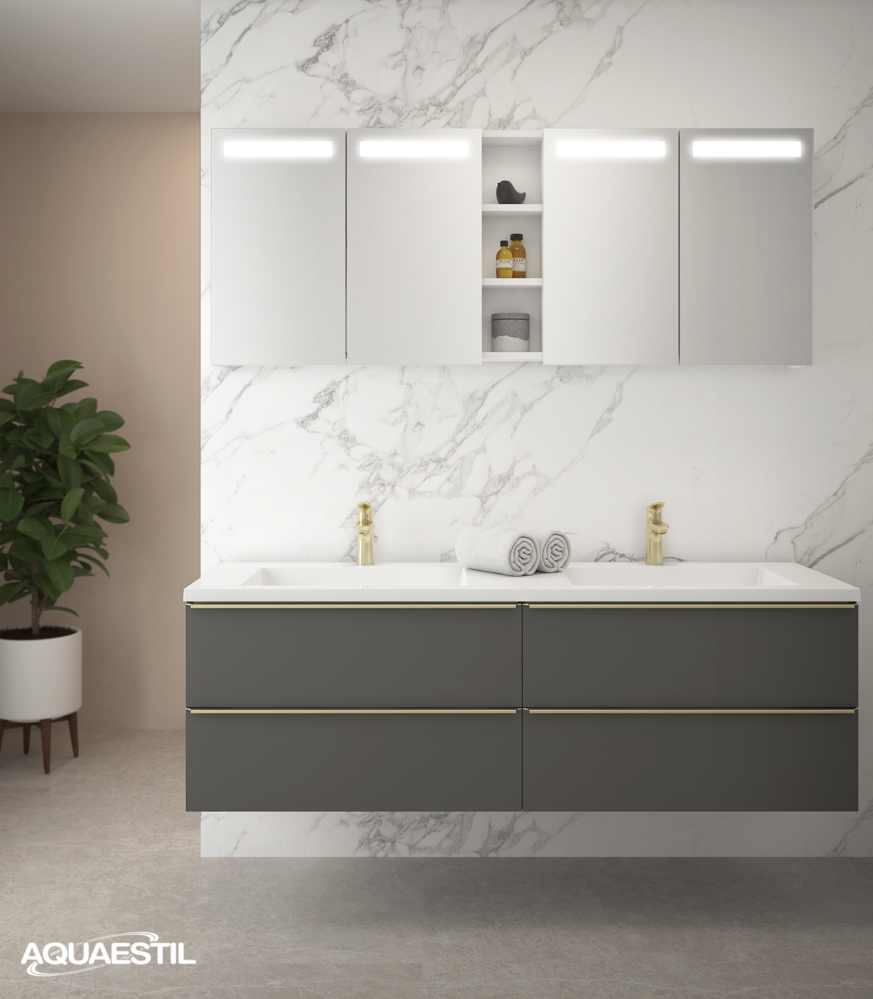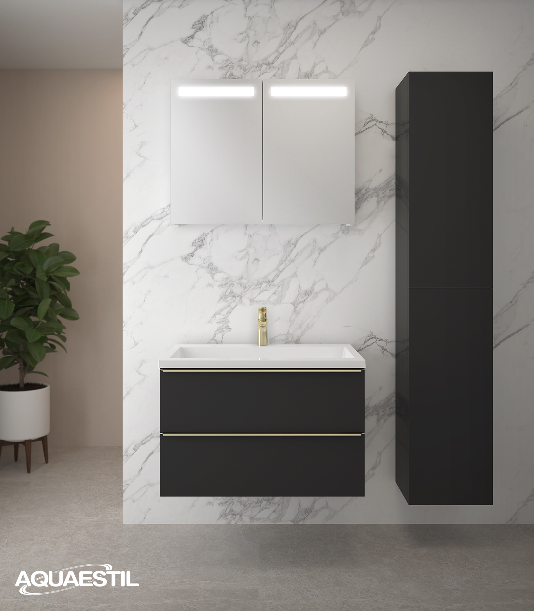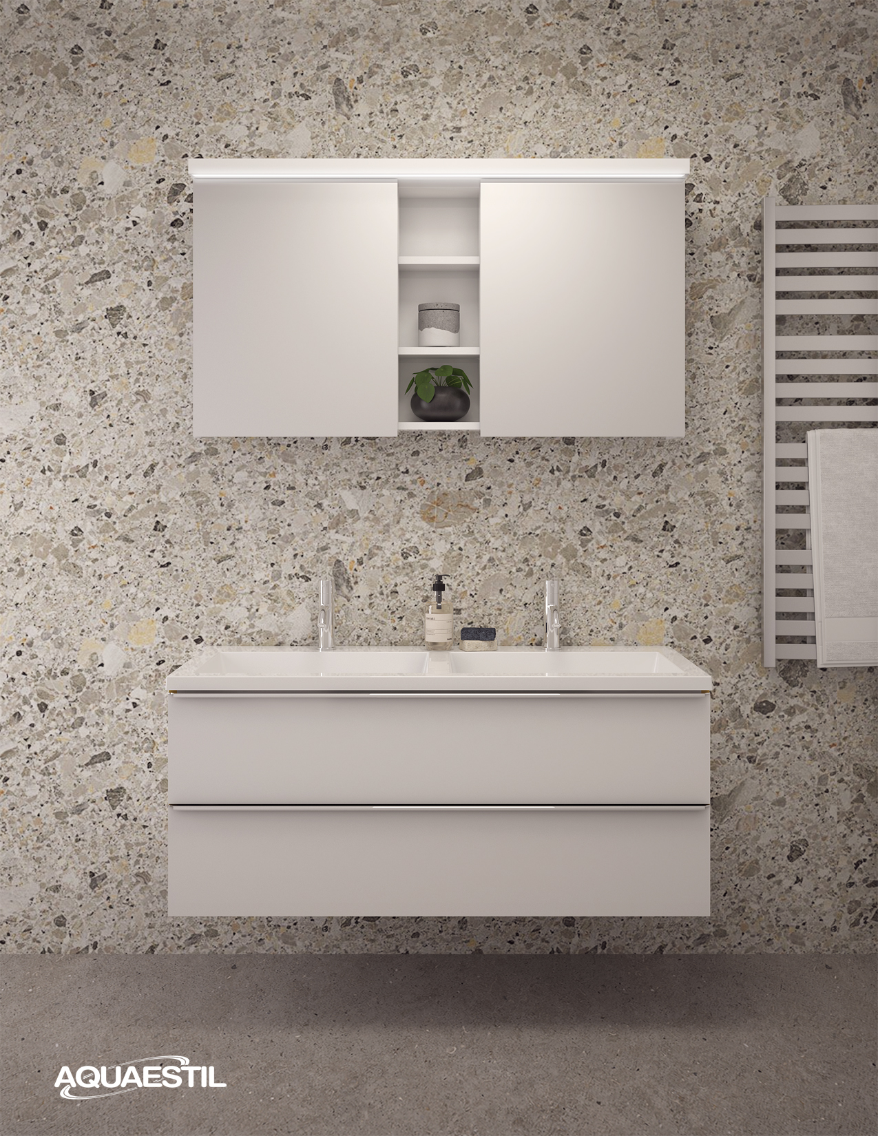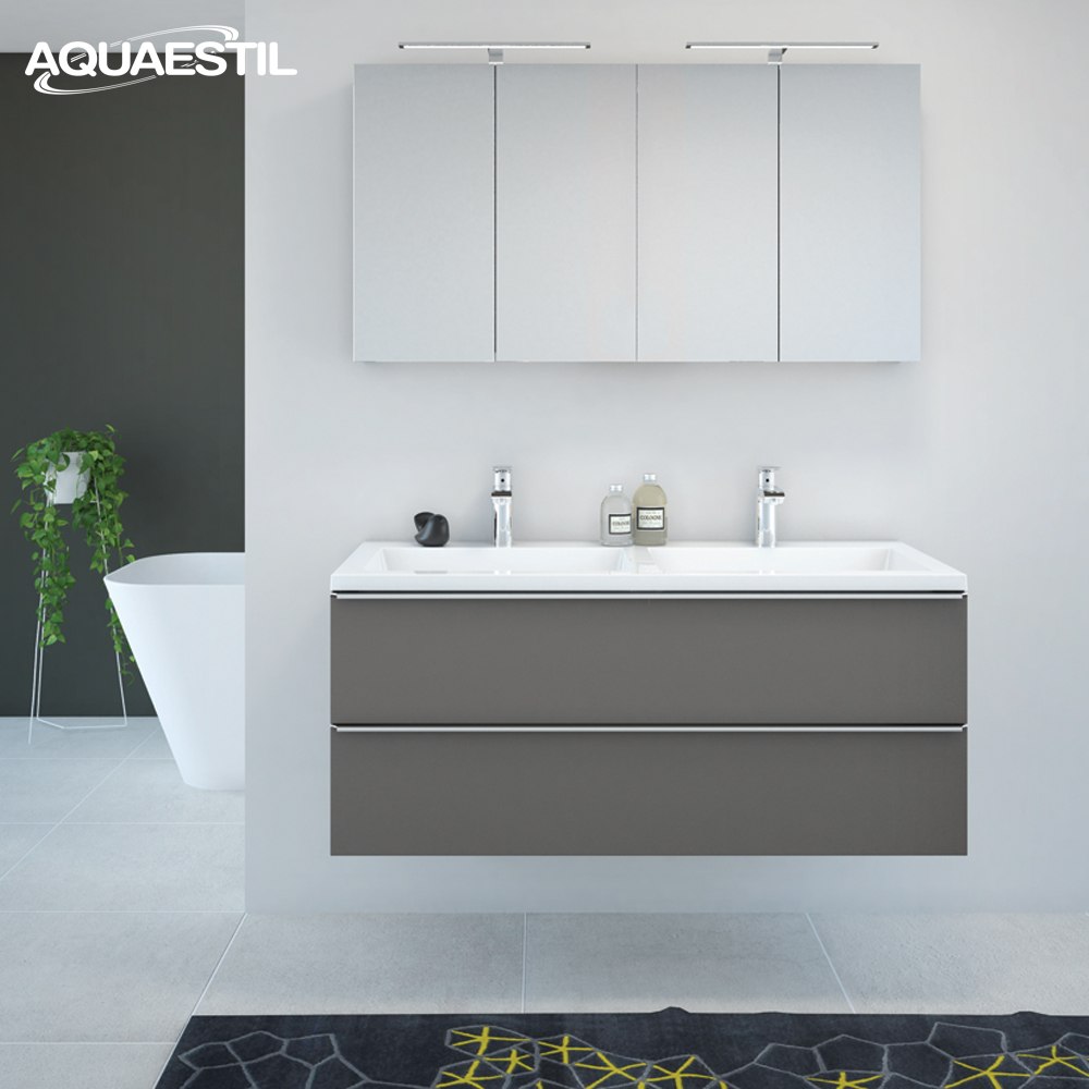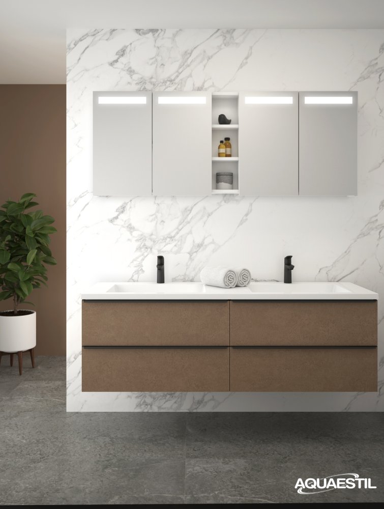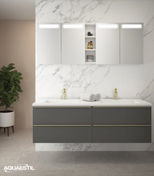 Aquaestil Badezimmermöbel sind in erster Linie für feuchte Umgebungen konzipiert. Präzise Konstruktion, hochwertige Fertigung, zusätzliche Verfahren zur Sicherstellung von Wasser- und Feuchtigkeitsbeständigkeit, sorgfältige Endbearbeitung und rigorose Tests jeder Aquaestil Badezimmermöbellinie unter feuchten Bedingungen garantieren einen Schutz gegen die Auswirkungen von Feuchtigkeit und Wassereintritt.