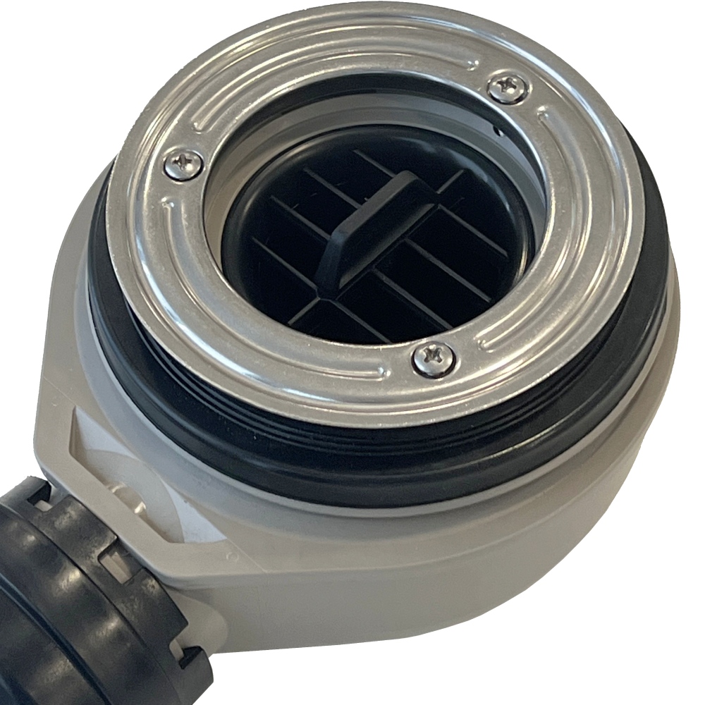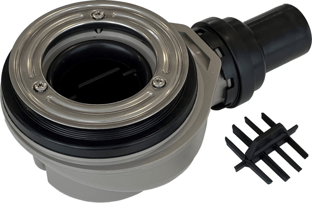 Siphon von Geberit für Duschwannen mit eigener Siphonabdeckung. Kompatibel mit Stone, Stone DeLuxe, Tempo DeLuxe, Teso DeLuxe, Shiny Duschwannen. Wird mit einem entnehmbaren Kammeinsatz geliefert.
