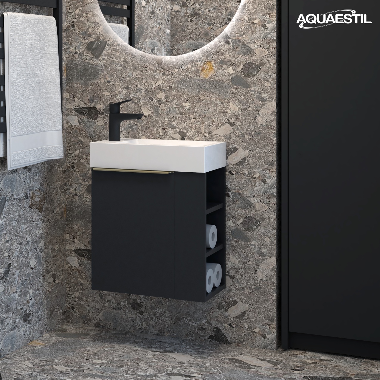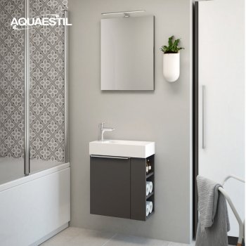 The material used in Aquaestil bathroom furniture is moisture-resistant, but not entirely waterproof. Prolonged exposure to high humidity and water can cause swelling on the edges of wooden parts and may lead to potential corrosion of mirrors.