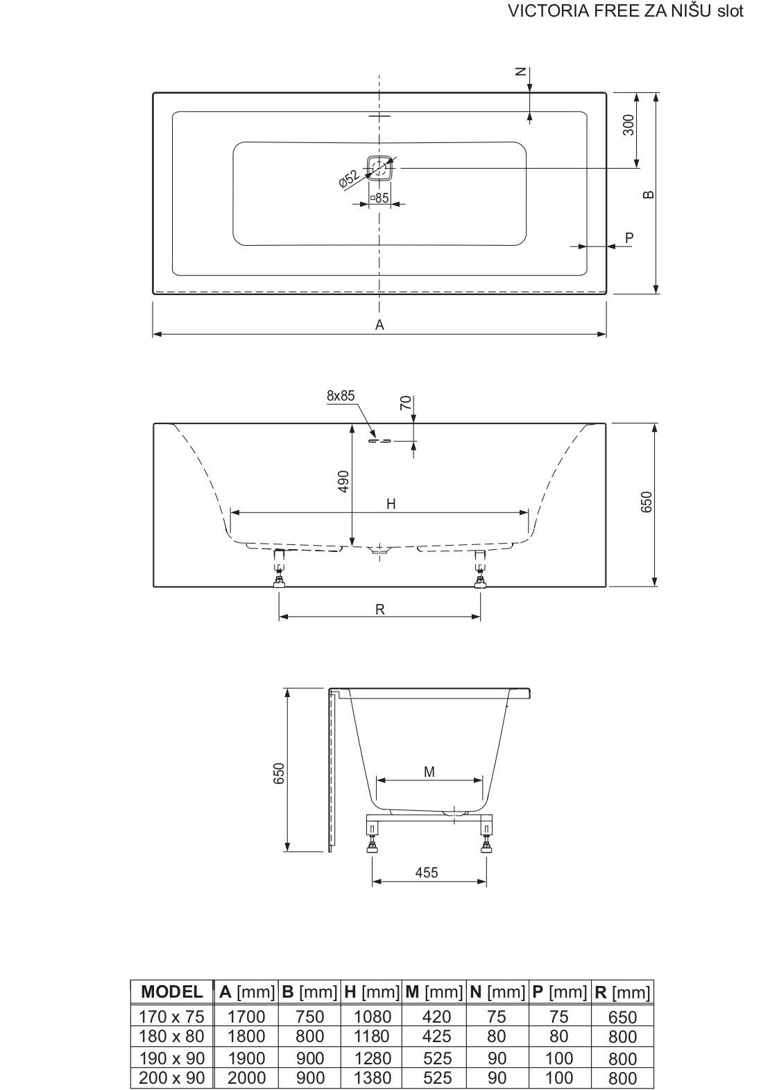 Victoria Free je serija pravokutnih kupaonskih kada čije su glavne karakteristike elegantan dizajn, udobnost i jednostavna montaža. Kupaonske kade ove serije izrađene su od kvalitetnog lijevanog sanitarnog akrila koji je ugodan na dodir, otporan, prirodno protuklizan te jednostavan za održavanje. Kupaonske kade Victoria Free dolaze s tvornički ugrađenim postoljem i preljevno-otočnom garniturom sa „slot“ preljevom i „klik-klak“ ventilom sifona. Svi elementi tvornički su sastavljeni te se kada isporučuje spremna za ugradnju u Vašu kupaonicu.