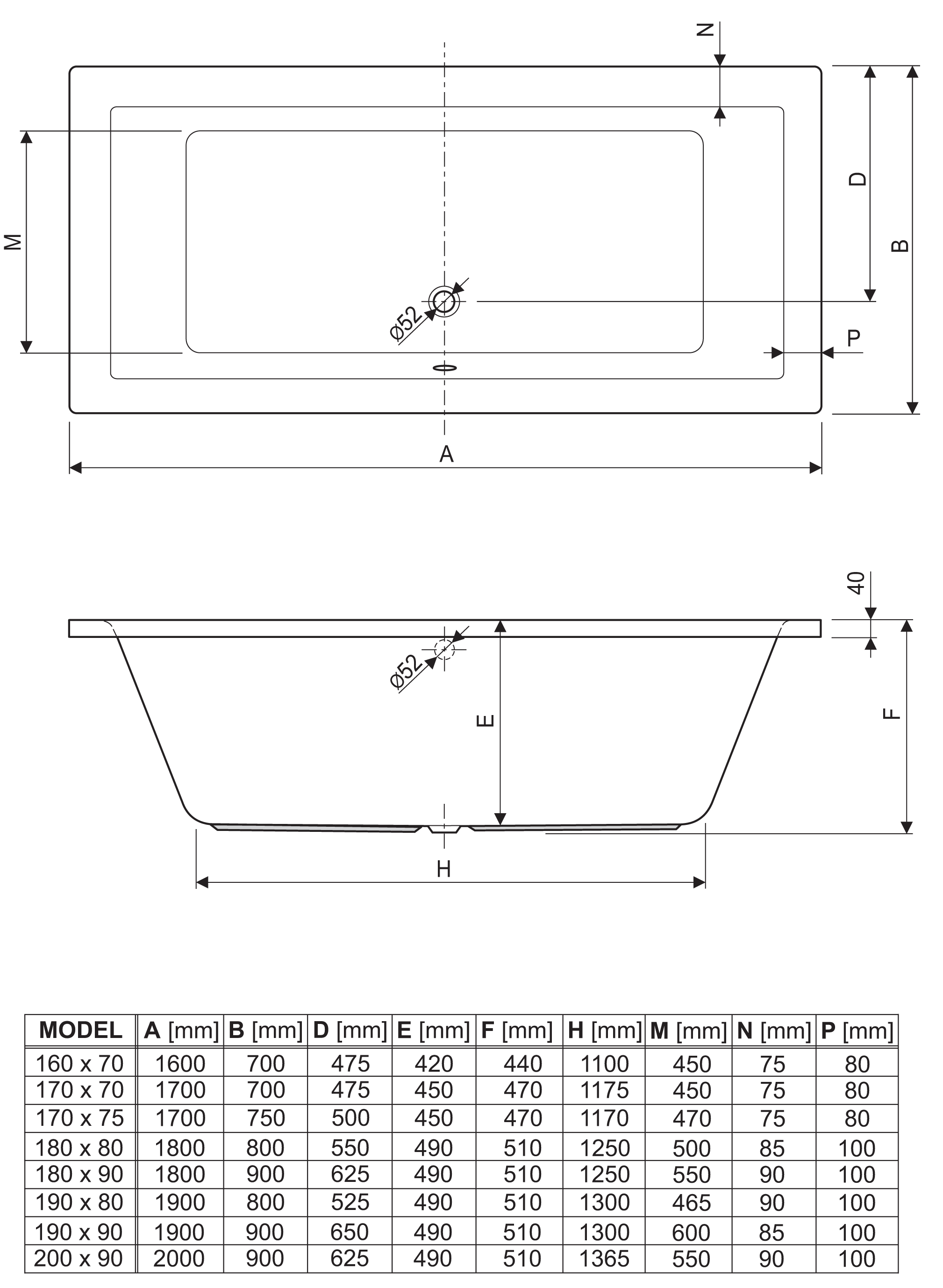 - Visina s oblogom za dimenzije manje od 180 je 60 cm.