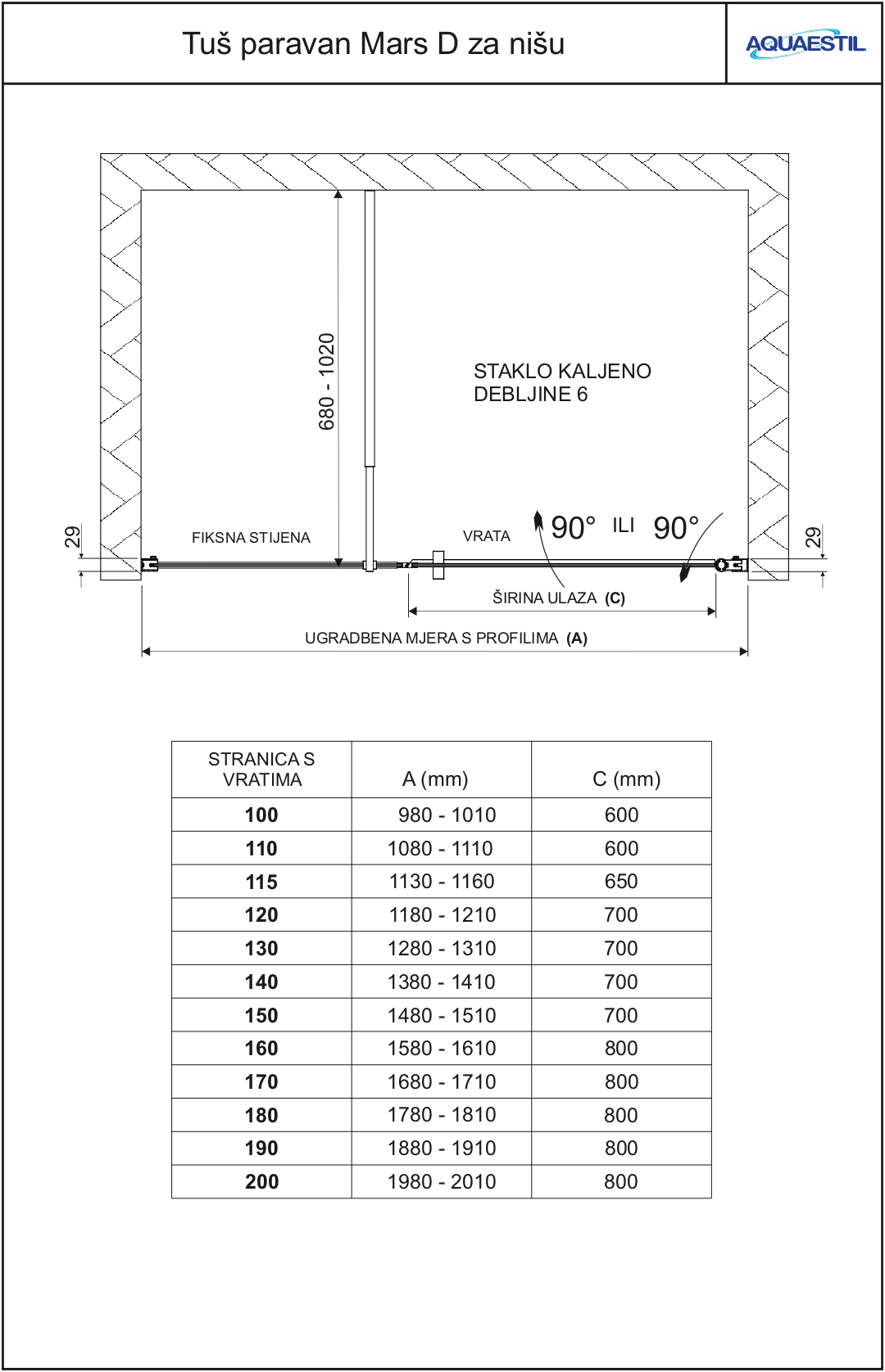 Mars D za nišu je kvalitetan paravan koji je namijenjen ugradnji između 3 zida (u nišu), a sastoji se od jedne fiksne stijene i okretnih vrata. Paravan je opremljen elegantnim, u presjeku okruglim profilima i 6 mm kaljenim staklom koje je tvornički tretirano nano-nanosom protiv kamenca. Kod naručivanja paravana s reljefnim staklom, potrebno je definirati smjer otvaranja vrata (L ili D). Prilikom montaže paravana moguće je podesiti smjer otvaranja vrata (prema unutra ili prema van).