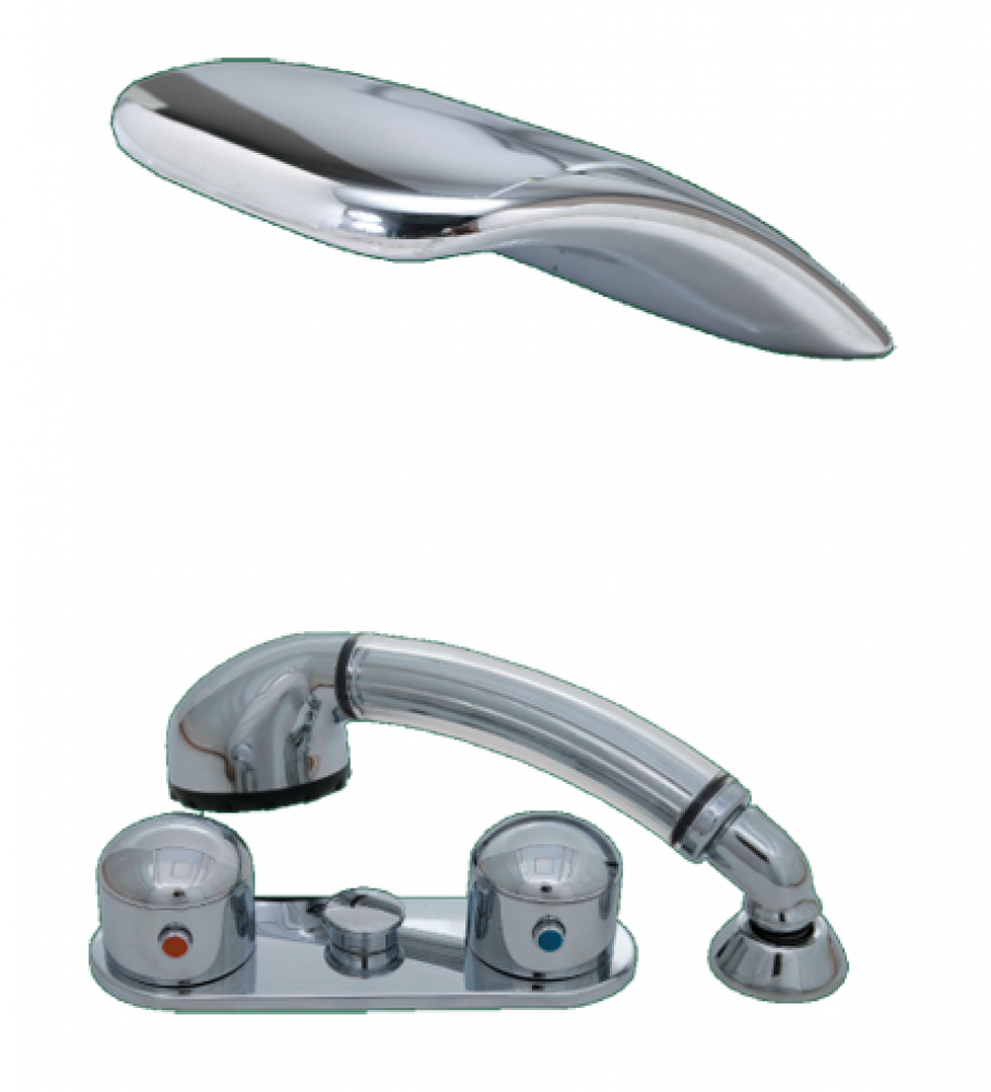 Gruppo bordo vasca a due manopole, con deviatore e doccetta installabile su quasi tutti i tipi di vasca. La bocca effetto cascata Cristina è particolarmente adatta all’installazione sulle vasca ad angolo.
