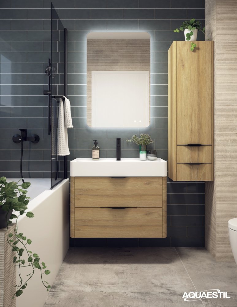 Il materiale dei mobili da bagno Aquaestil è resistente all'umidità, ma non completamente impermeabile. L'esposizione prolungata a livelli elevati di umidità e acqua può causare il rigonfiamento dei bordi delle parti in legno dei mobili e la possibile corrosione degli specchi.