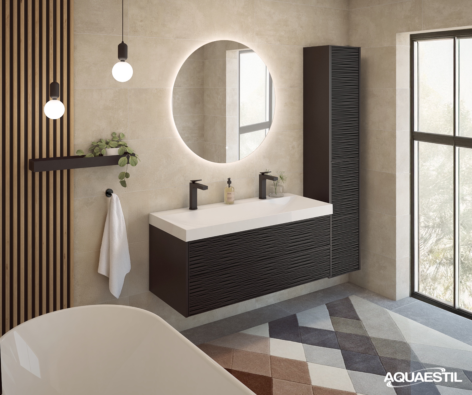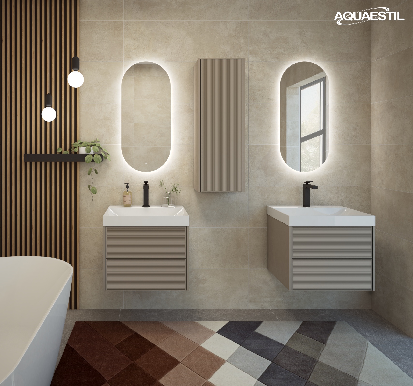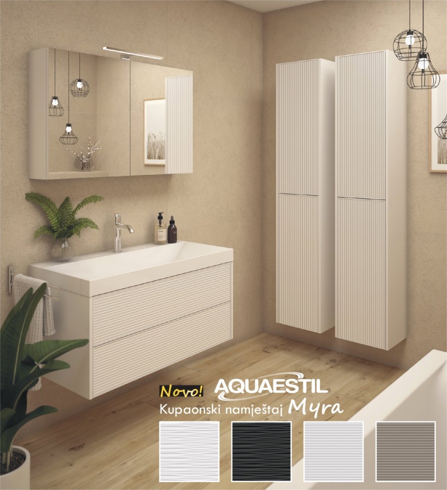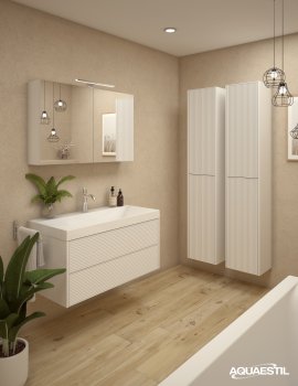 La linea Myra offre un design sofisticato con frontali tridimensionali caratterizzati da motivi a righe o a coste. L’ampio lavabo dal profilo sottile, completato da una copertura dello scarico con effetto superficie, esalta ulteriormente l’eleganza contemporanea degli elementi della collezione.