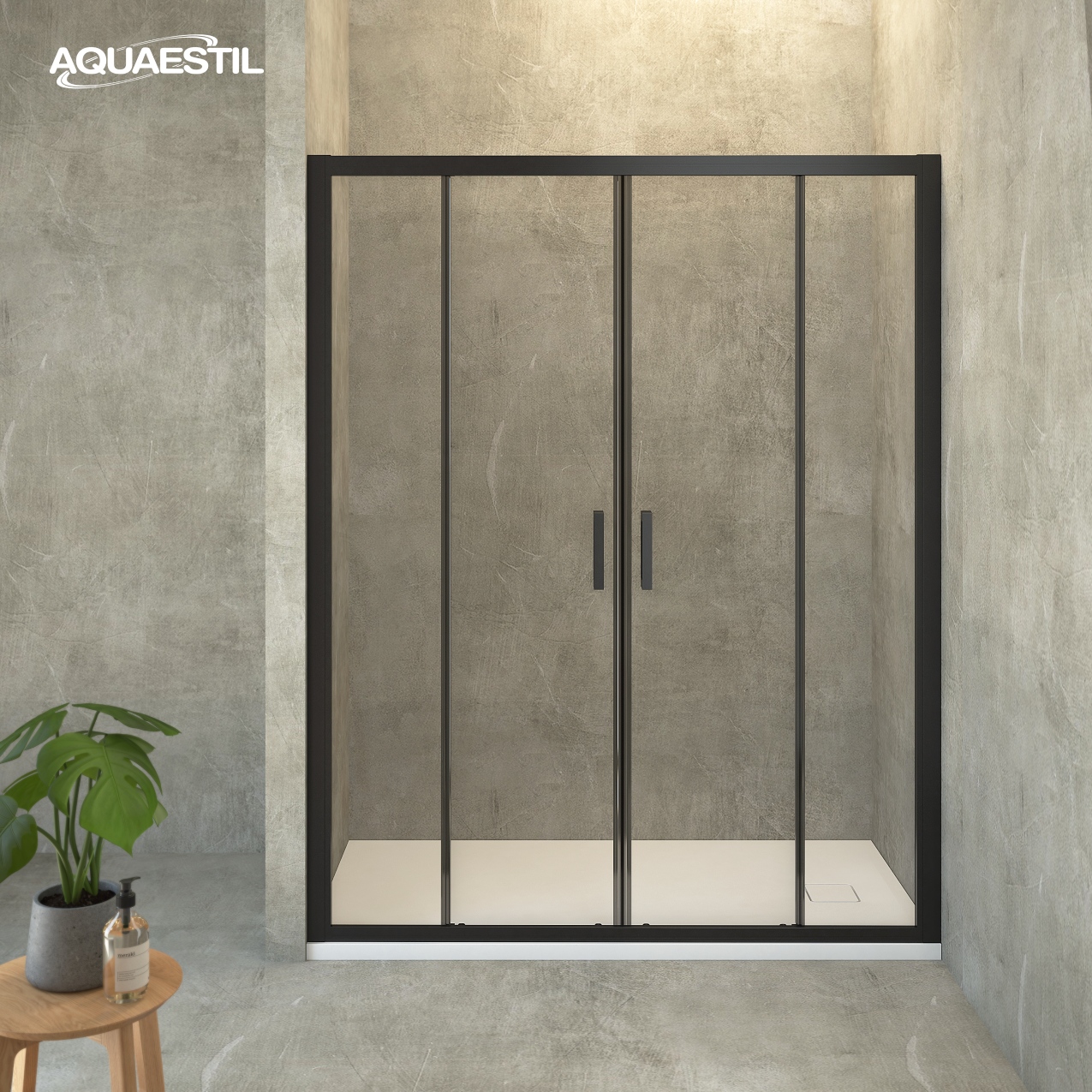 Questo box doccia moderno si compone di due porte scorrevoli e due ante fisse, sviluppate per piatti doccia di grandi dimensioni installati fra tre muri. Per questo modello è possibile aggiungere un profilo d'estensione di 3 cm.