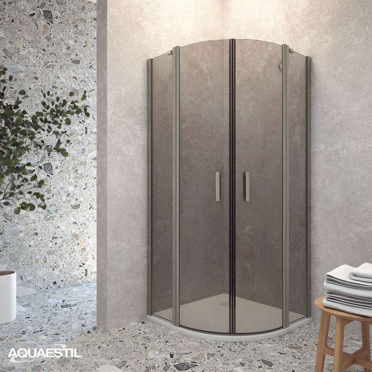 Moderen polkrožni tuš paravan, ki ga sestavljata dve stranici „D“ z vrati. Vsaka stranica vključuje navadna vrata in fiksni del. Paravan je opremljen z elegantnimi profili, ki so na voljo v srebrni, črni mat ali beli mat barvi, ter 6 mm kaljenim steklom z tovarniško nanesenim nano-premazom proti vodnemu kamnu. Magnetna tesnila in sistem dviga vrat zagotavljajo visoko raven funkcionalnosti in zaščito pred pršenjem.