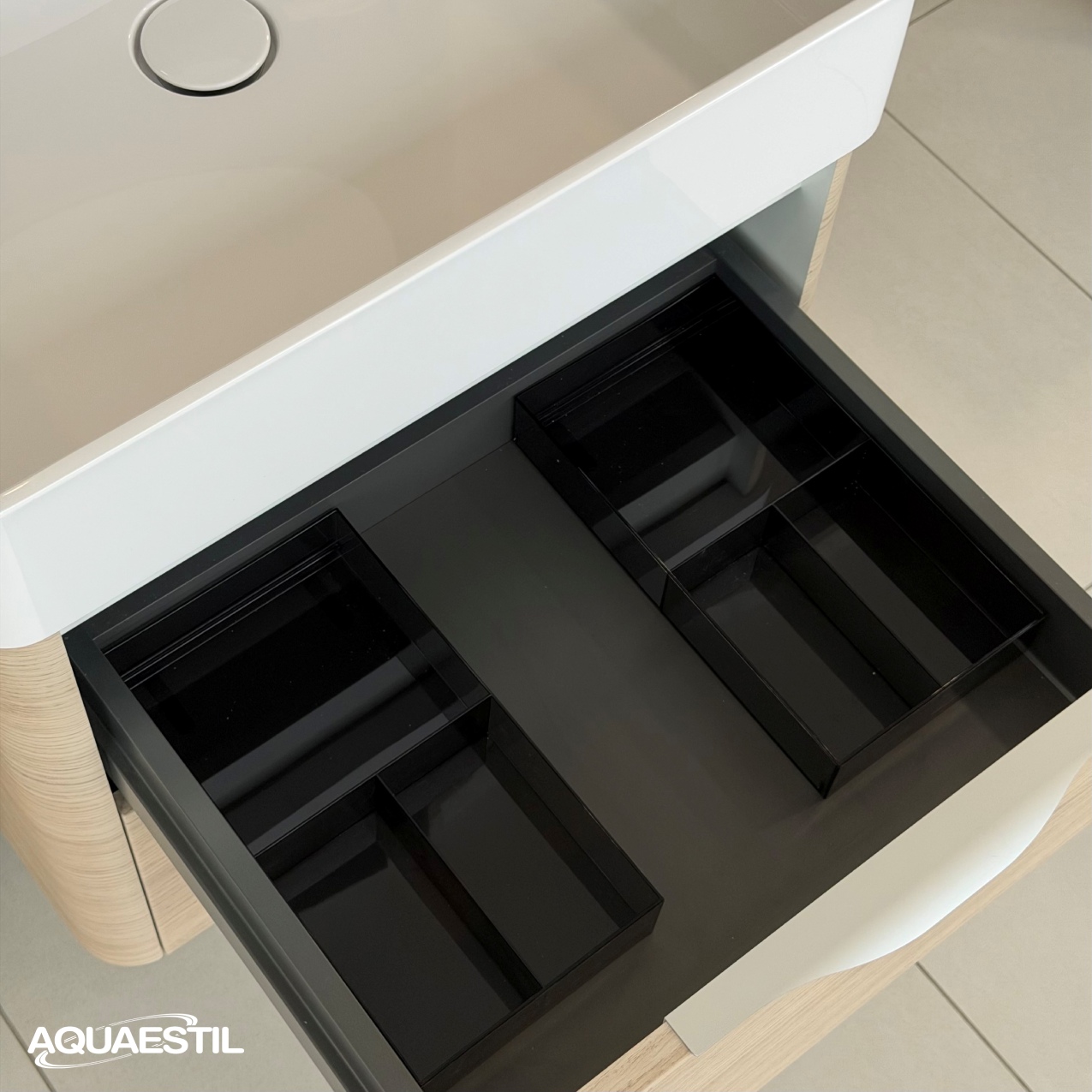 Rounded edges and subtle details of Ardea line create a unique harmony of elements whose design radiates timeless elegance and effortless functionality. The spacious washbasin offers a distinctive sense of lightness and generous storage space, while additional storage is provided by a low-profile siphon that requires no cut-out in the top drawer, as well as a practical organizer included as standard with Ardea vanity units. Vanity units come with a low-profile siphon and a drawer organizer as standard.