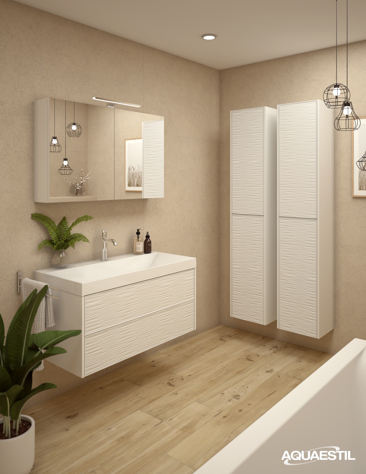 Myra line brings a sophisticated design with distinctive 3D textured fronts in striped or ribbed patterns. A large, minimalist washbasin with thin edges and a surface-effect waste cover further accentuates the contemporary elegance of this collection.