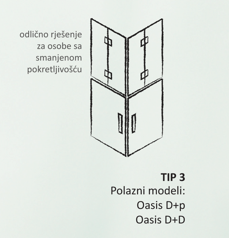 Tip 3 - Pomoću modela iz linije Oasis moguće je izvesti vrlo praktično rješenje za osobe sa smanjenom pokretljivošću. Donji dio paravana sastoji se od dvije stranice koje se otvaraju prema van, a gornji dio u potpunosti se preklapa prema unutra ili prema van, dozvoljavajući potpuni pristup osobi unutar prostora za tuširanje. Konfiguracija i dimenzije se mogu prilagoditi prema Vašim željama.