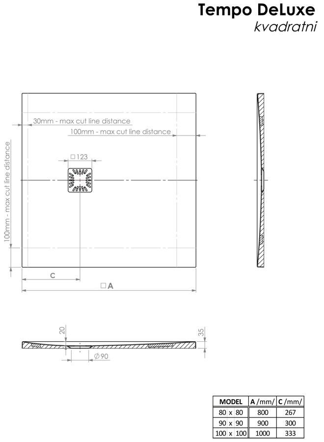 - Tuš kadu Tempo DeLuxe moguće je samostalno ili tvornički rezati unutar određenih gabarita. Prilikom narudžbe tvorničkog rezanja potrebno je priložiti skicu s označenim reznim linijama.