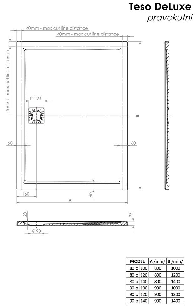 - Il piatto doccia Teso DeLuxe può essere tagliato entro determinate dimensioni. Quando si ordina il taglio di fabbrica, è necessario allegare uno schizzo con linee di taglio contrassegnate.